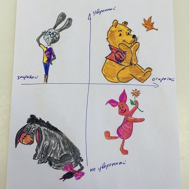 - Расскажите подробнее об определении психотипа клиента. - Есть очень простой и интересный метод. Условно всех людей можно разделить на четыре психологических типа: «уверенный/открытый», «уверенный/закрытый», «неуверенный/открытый», «неуверенный/закрытый». Нагляднее всего под эти определения подходят герои известной всем сказки Алана Милна - Винни-Пух, Кролик, Пятачок и Иа.