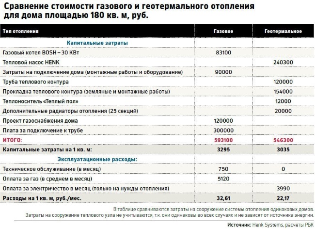 «Если брать частный дом площадью до 1000 кв. м, то газ вообще не нужен, – считает Савостьянов. – Это просто политика государственная, наверное, газ продавать». Для дома в 180 кв. м тепловой насос Henk System со всеми расходами на установку обойдется примерно в 600 тыс. руб. Это вполне сопоставимо со стоимостью газового отопления с учетом сборов за подключение к трубе (см. таблицу).