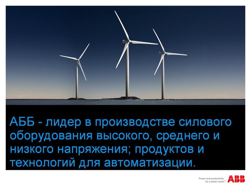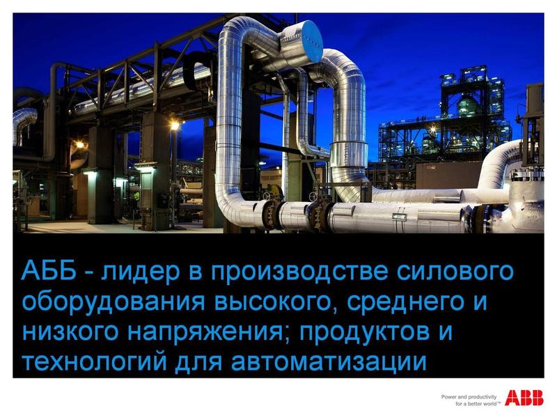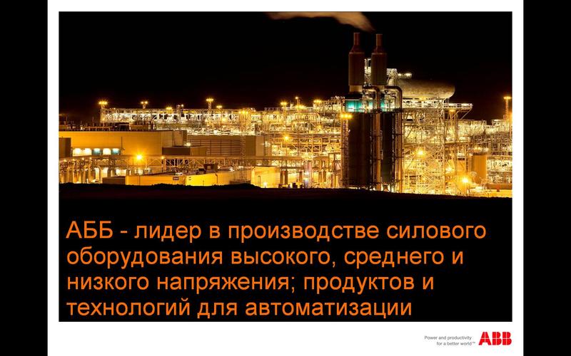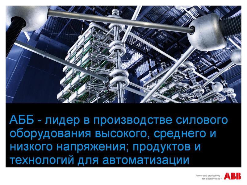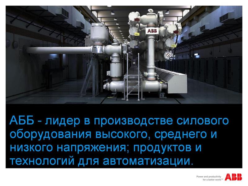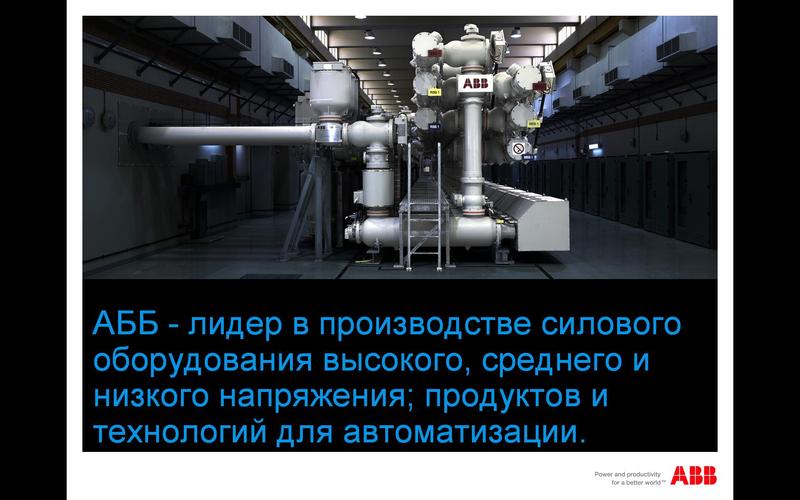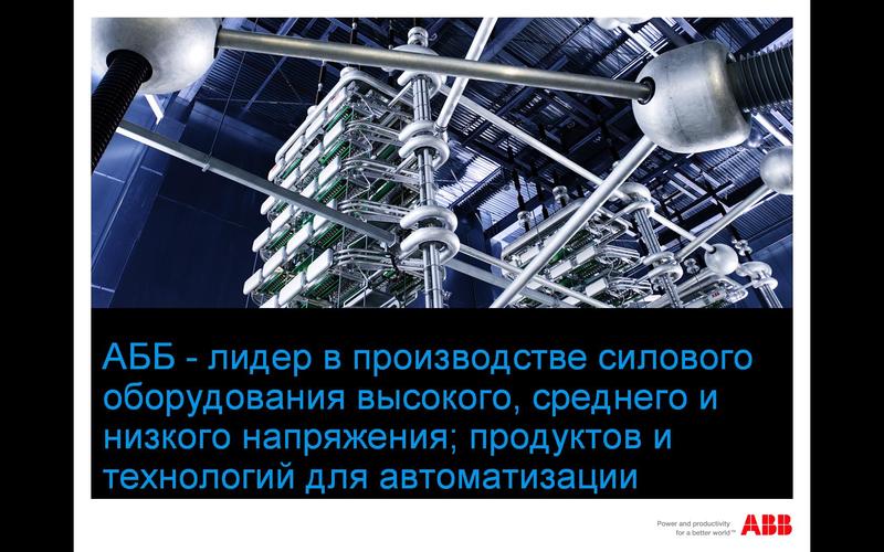 АББ (ABB)-лидер в производстве силового оборудования высокого, среднего и низкого напряжения; продуктов и технологий для автоматизации. Технологии АББ позволяют промышленным предприятиям и энергетическим компаниям повышать свою производителльность труда, снижая негативное воздействие на окружающую среду.