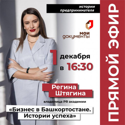 МФЦ «Мои Документы» проведет прямой эфир в рамках проекта «Бизнес в Башкортостане. Истории успеха»МФЦ «Мои Документы» проведет прямой эфир в рамках проекта «Бизнес в Башкортостане. Истории успеха» МФЦ Республики Башкортостан проведет четвёртый в этом году прямой эфир с предпринимателем в социальной сети «Вконтакте» в рамках мотивационного проекта «Бизнес в Башкортостане. Истории успеха». Спикером выступит уроженка города Уфы, владелица PR агентства и единственной сертифицированной Академии PR и личного бренда, осуществляющая деятельность по всему миру Регина Штягина. В прямом эфире она расскажет свою историю открытия и ведения собственного дела в Башкортостане, а также даст советы по выводу бизнеса на международный уровень. - Проект направлен на повышение деловой активности граждан, вовлечение их в предпринимательскую деятельность на территории республики путем общения и обмена опытом с успешными предпринимателями Башкортостана. В ходе прямого эфира слушателям также представят услуги, которые организованы для бизнеса в офисах МФЦ, - прокомментировала Эльвира Габдрахимова, заместитель директора МФЦ Республики Башкортостан. Прямой эфир состоится 1 декабря, в 16:30 (время уфимское), участие бесплатное. Комментарии к прямому эфирам будут открыты для возможности общения со спикером. Ссылка на прямой эфир. Источник: Правительство РБ