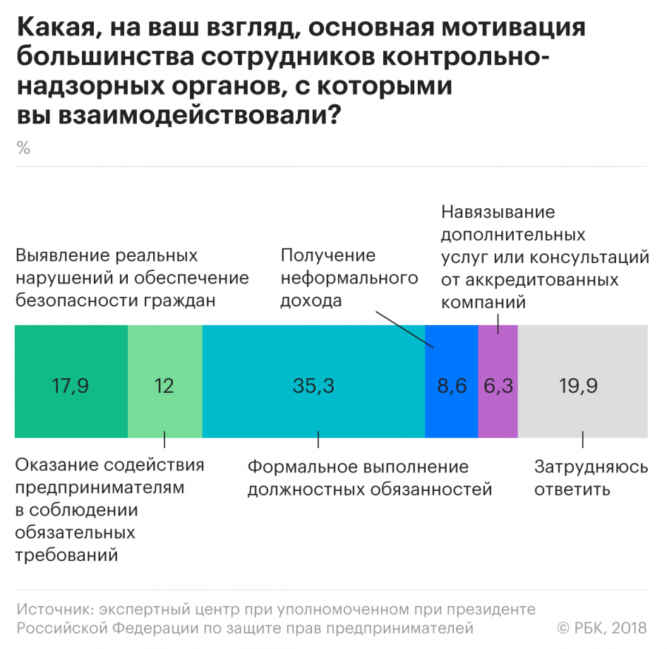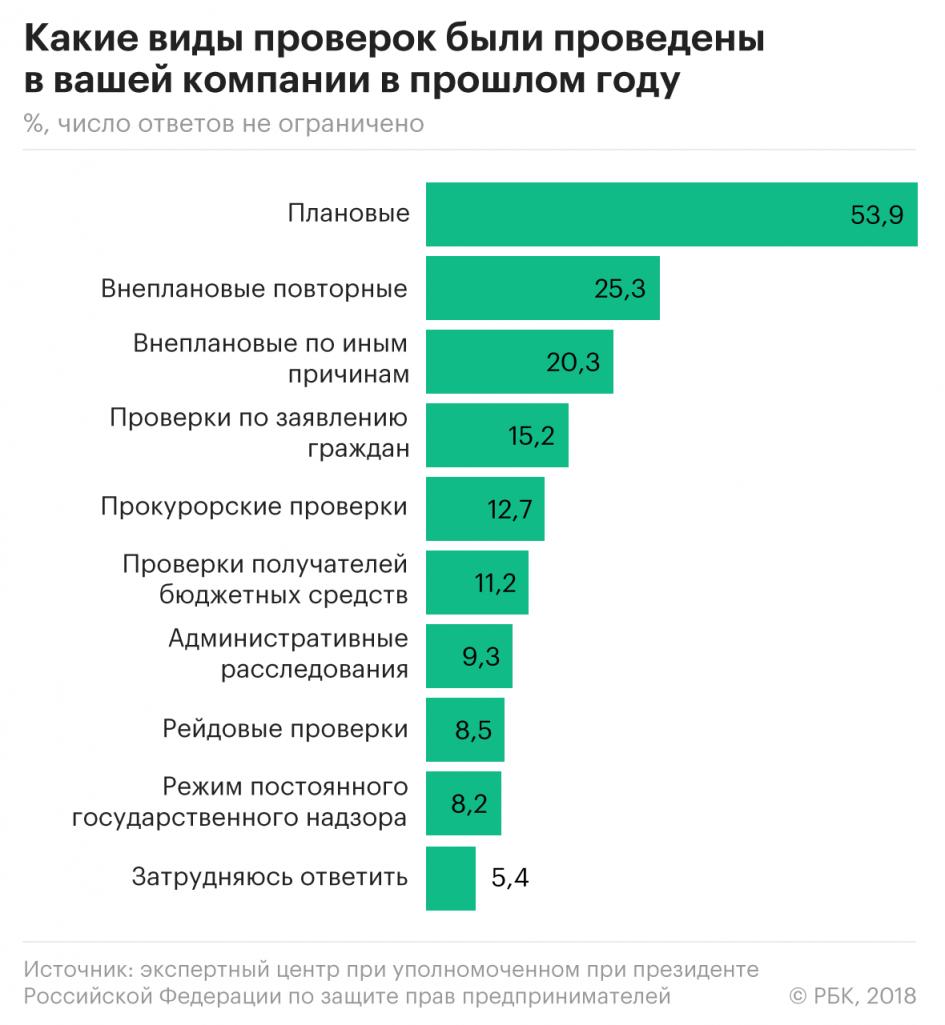 Легче всего, по идее, должен жить малый бизнес. С 1 января 2016-го по конец текущего года в России действует мораторий на плановые проверки малого бизнеса, и его планируют продлить до 2022-го. Однако сами предприниматели говорят об ужесточении контроля. Исследовательское агентство MAGRAM Market Research в мае опросило владельцев и руководителей 2197 компаний малого и среднего бизнеса из всех регионов России и предоставило результаты исследования РБК. 49% опрошенных заявили, что прошли через проверки за последний год. По данным MAGRAM Market Research, больше всего проверок проводили налоговые органы (42%), инспекторы пожарной безопасности (40%) и Роспотребнадзор (23%). Подтверждает это и исследование, выполненное по поручению уполномоченного при президенте РФ по защите прав предпринимателей: почти половина респондентов (42,8%) считают, что административная нагрузка на их бизнес за последний год увеличилась. 48,7% опрошенных проходили за год от одной до шести проверок, несмотря на надзорные каникулы.