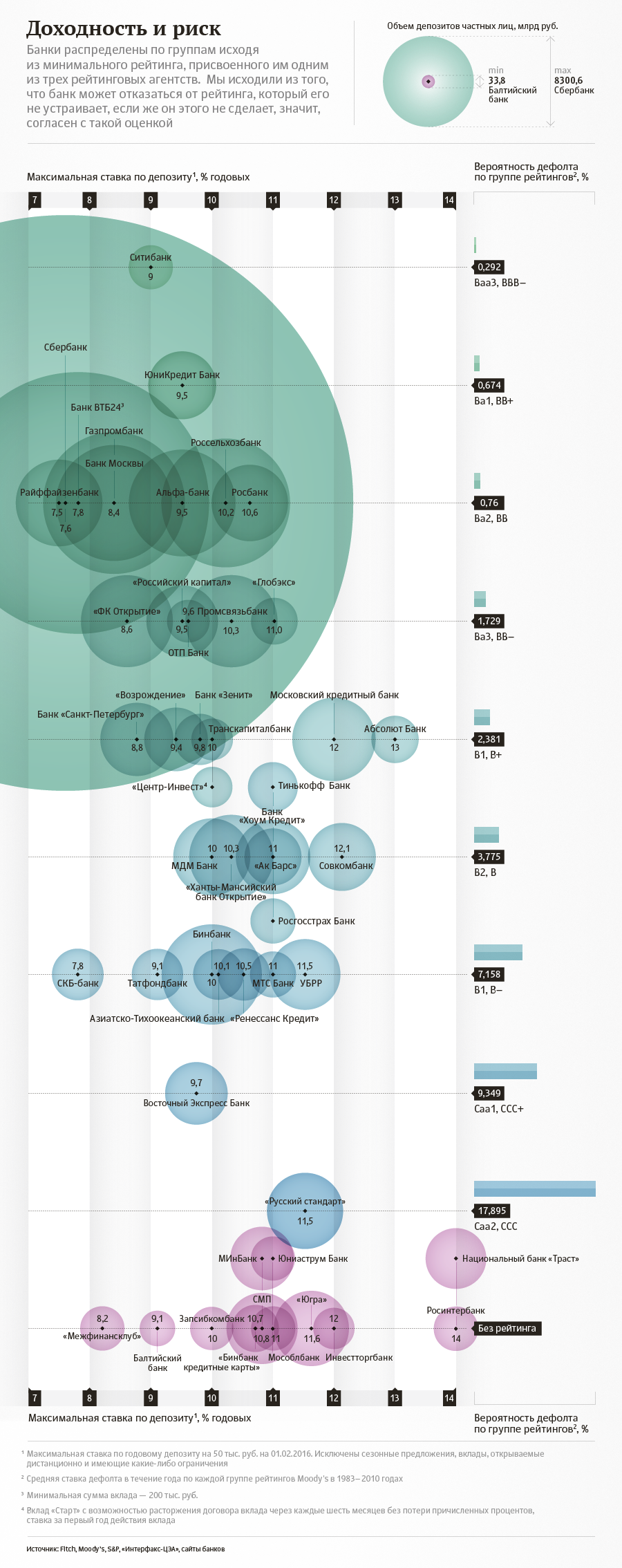 50 крупнейших банков по объему средств граждан мы распределили по группам надежности исходя из рейтингов, присвоенных им агентствами Moody’s, S&P и Fitch. Вероятность дефолта по каждой из групп взяли из данных S&P.